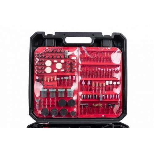 В гравировальный набор входят как многочисленные насадки с 3 мм хвостовиками, так и несколько цанг предназначенные для других хвостовиков, благодаря которым можно использовать насадки другого производителя, телескопический штатив и гибкий вал, приспособление, которое позволяет пропиливать пазы и ограничителем, который регулируется по высоте.