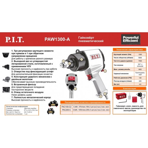 Гайковёрт ударный пневматический P.I.T. PAW1300-A — это инструмент для монтажа и демонтажа гаек и болтов.