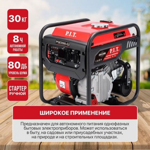 Инверторный бензиновый генератор PGE5500-G2 предназначен для автономного питания однофазных бытовых электроприборов. Может использоваться в быту, на садовых или приусадебных участках, на природе и на строительных площадках.