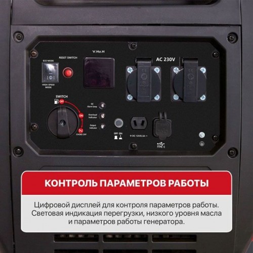 Генератор оборудован автоматическим выключателем для защиты от перегрузки и от работы с низким уровнем масла. Переключатель оборотов холостого хода позволяет экономить энергию и топливо при подключении оборудования с низким энергопотреблением - генератор переходит в режим энергосбережения, когда не требуется полная мощность.