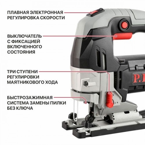 Три положения регулировки маятникового хода для быстрого реза, в т.ч. толстых заготовок, и выключатель с фиксацией включенного состояния для продолжительной работы.