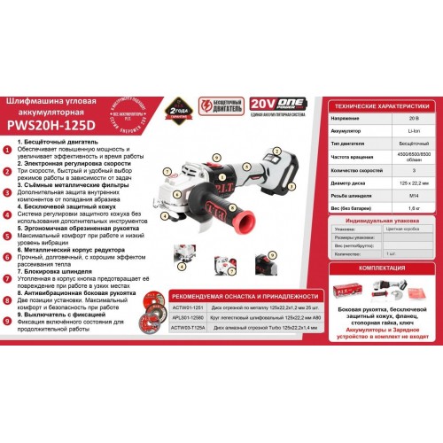 Аккумуляторная угловая шлифмашина PWS20H-125D входит в семейство инструментов единой аккумуляторной системы OnePower20V. К инструменту подходят все аккумуляторы системы OnePower20V