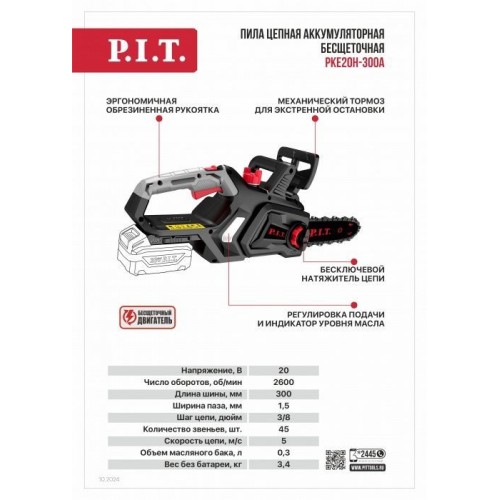 Пила цепная аккумуляторная P.I.T. PKE20H-300A SOLO (без АКБ и ЗУ)