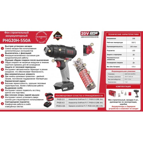 Аккумуляторный термопистолет P.I.T. PHG20H-550A (без АКБ и ЗУ)