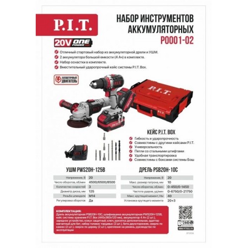 Набор аккумуляторных инструментов P.I.T. P0001-02 (УШМ PWS20H-125B, дрель PSB20H-10C)
