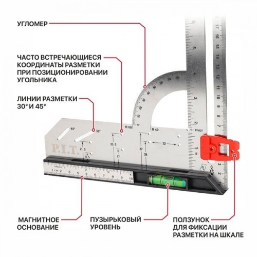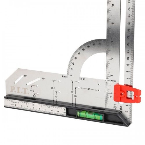 Угольник разметочный магнитный с пузырьковым уровнем P.I.T. DRUA HSQR03-0300 (300мм, транспортир)